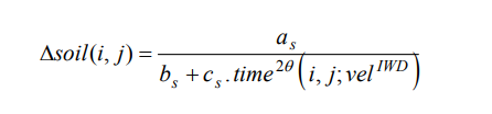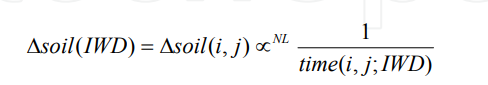 بعلاوه خاکِ IWD (soil(IWD)) با حذف شدن مقداری از خاک موجود در مسیر i , j افزایش پیدا میکنه. مقدار خاک اضافه شده به IWD (Δsoil(IWD)= Δsoil(i,j)) یک تناسب معکوسی داره با میزان زمانی که طول میکشه IWD از مسیر مورد نظرمون بگذره. باز هم یعنی اگه خاک بیشتر باشه زمان کمی طول میکشه و بالعکس: