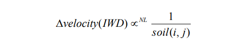 حواستون باشه که اینجا منظور ما از ∝NL همون تناسب غیر خطی است. یه فرمول محتمل دیگه این پایین میاریم که باهاش شتابِ IWD (velIWD(t)) رو به وسیله میزان خاک موجود بین دو نقطه i , j محاسبه میکنیم:
