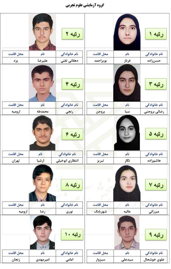 10 نفر برتر گروه آزمایشی علوم تجربی 1401