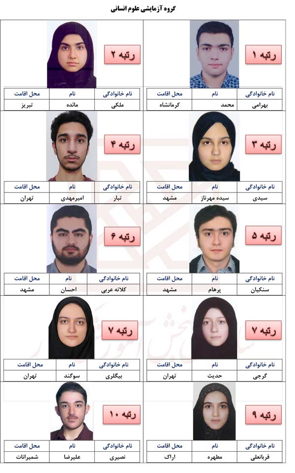 10 نفر برتر گروه آزمایشی علوم انسانی 1401