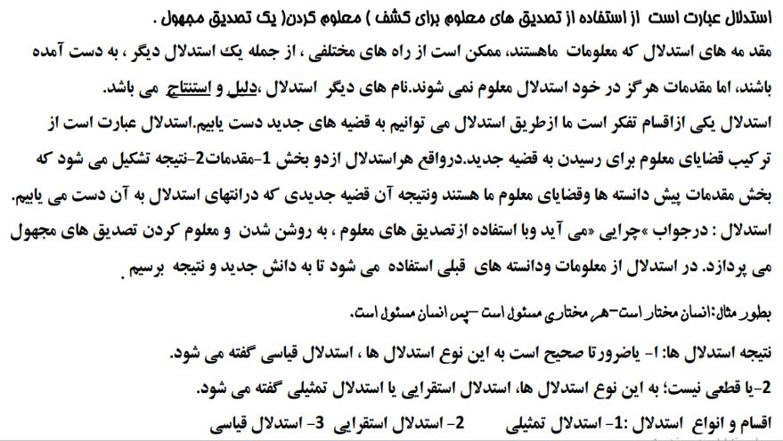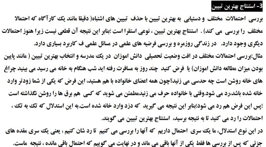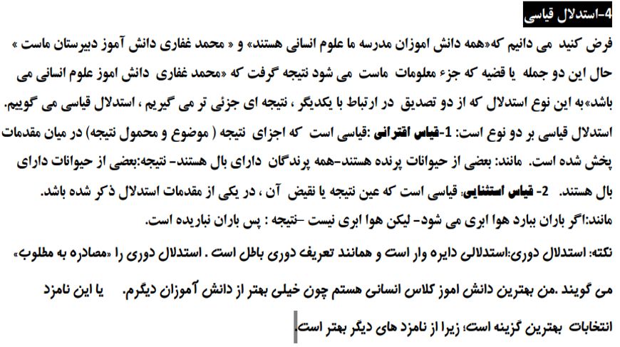 1)استدلال قیاسی است . قابلمه و دسته ی آن هر دو فلزی هستند ، هر شیء فلزی نمی سوزد . پس قابلمه و دسته ی آن نمی سوزند .