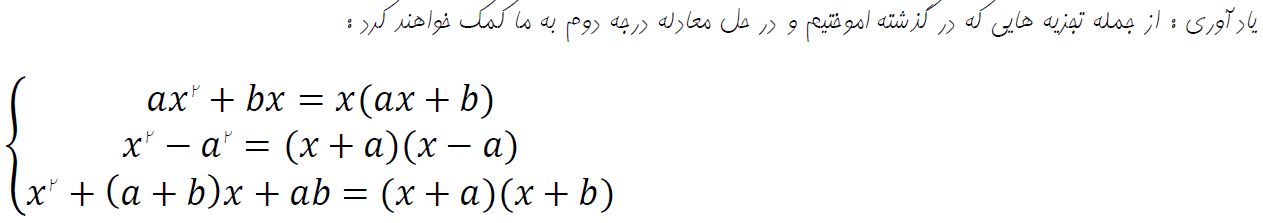با دو تا نکته بالا قطعا فهمیدید که برای حل معادله درجه دوم به روش تجزیه ابتدا باید معادله را تجزیه کنیم و سپس تک تک عبارت ها را برابر صفر قرار دهیم.
