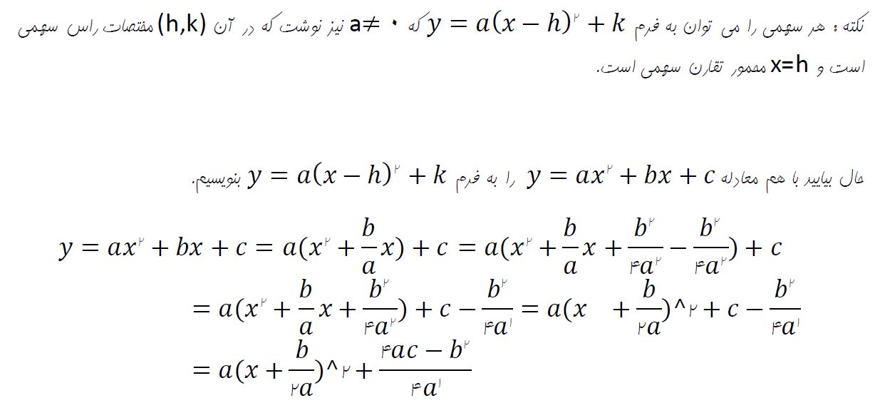 ‼️ نکته : به خطی موازی محور ایگرگ ها که سهمی را به دو قسمت مساوی تقسیم می کند محور سهمی یا خط تقارن سهمی می گویند.
