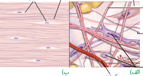 ۳) مقدار و نوع رشتهها و ماده زمینهای در بافت (الف) و (ب) با هم متفاوت است.