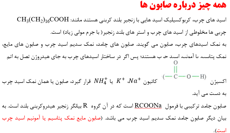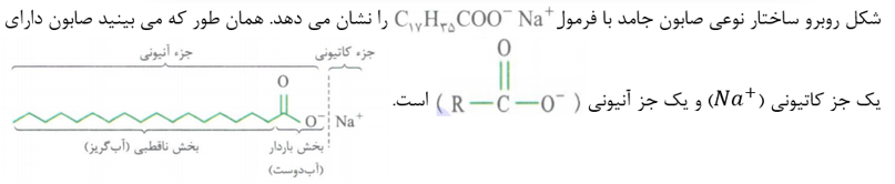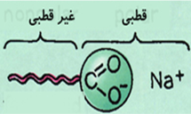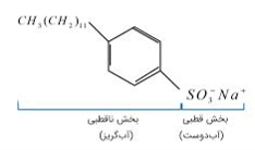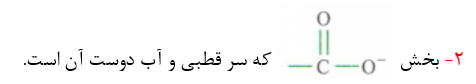 1- بخش زنجیر هیدروکربنی که اب گریز است و در نتیچه چربی دوست است و سر ناقطبی صابون را تشکیل می دهد.