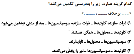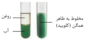 اغلب موادی که در زندگی روزانه با آنها سر و کار داریم، جزء مخلوطها هستند. در شیمی دهم با مخلوط های همگن (محلولها) آشنا شدیم. همان طور که میدانید محلولها (مانند محلول مس (∏) سولفات در آب)، پایدارند و نور را عبور می دهند. حالا می خواهیم با دو دسته دیگر از مخلوط ها (کلوئیدها و سوسپانسیون ها) آشنا شویم. کلوئیدها و سوسپانسیو نها جزء مخلوطهای ناهمگن هستند. ذره های سازنده این مخلوط ها، درشت تر از محلول ها است، به همین دلیل برخلاف محلولها نور را پخش می کنند. شکل روبه رو مقایسه رفتار نور در یک محلول و کلوئید را نشان میدهد. همان طور که می بینید کلوئید برخلاف محلول، مسیر عبور نور از میان کلوئیدها قابل دیدن است. ذره های سازنده کلوئیدها همانند محلول ها با گذشت زمان ته نشین نمی شوند؛ بنابراین می توان گفت کلوئیدها پایدار هستند. موادی مانند انواع رنگ ها و چسب ها، سرامیک ها، شیر، ژله و سس مایونز کلوئید هستند. اما سوسپانسیون ها (مانند شربت معده) ناپایدارند و با گذشت زمان، ذره های سازنده آنها ته نشین می شوند.
