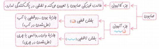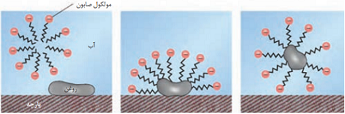 هرگاه مخلوط مقداری از صابون و آب را هم بزنیم، مولکول های صابون در سرتاسر مخلوط پخش می شوند. اگه گفتین چرا؟ نیروی جاذبه میان مولکول های آب و صابون به اندازه ای است که باعث پخش شدن صابون در آب می شود؛ به عبارت دیگر نیروی جاذبه میان مولکول های آب و صابون در مخلوط، از میانگین نیروهای جاذبه میان مولکول های آب و میان مولکول های صابون بیشتر است (میان بخش قطبی جزء آنیونی صابون و مولکول های آب، جاذبه یون - دوقطبی ایجاد می شود. در ضمن مخلوط آب و صابون، خاصیت بازی دارد. می دانید که کاغذ پی اچ در محیط های اسیدی به رنگ سرخ و در محیطهای بازی به رنگ آبی در می آید؛ پس کاغذ پی اچ در مخلوط آب و صابون، به رنگ آبی در خواهد آمد. به همین ترتیب هرگاه مقداری صابون مایع را در روغن بریزیم و مخلوط را به هم بزنیم، مخلوط به ظاهر همگنی به دست می آید. این مشاهده نشان میدهد که بین بخش ناقطبی صابون و مولکول های ناقطبی روغن، نیروی جاذبه واندروالسی برقرار می شود؛ به همین دلیل مولکول های صابون در سرتاسر روغن مایع پخش می شوند. خلاصه این که صابون ماده ای است که هم در چربیها و هم در آب حل می شود. حالا به راحتی میشه فهمید که صابون چه جوری چربی ها را پاک می کند. چربی ها ناقطبی هستند؛ به همین دلیل آب به تنهایی نمی تواند چربی ها را پاک کند. وقتی صابون وارد آب می شود، کاتیون و آنیون آن از هم جدا می شوند.