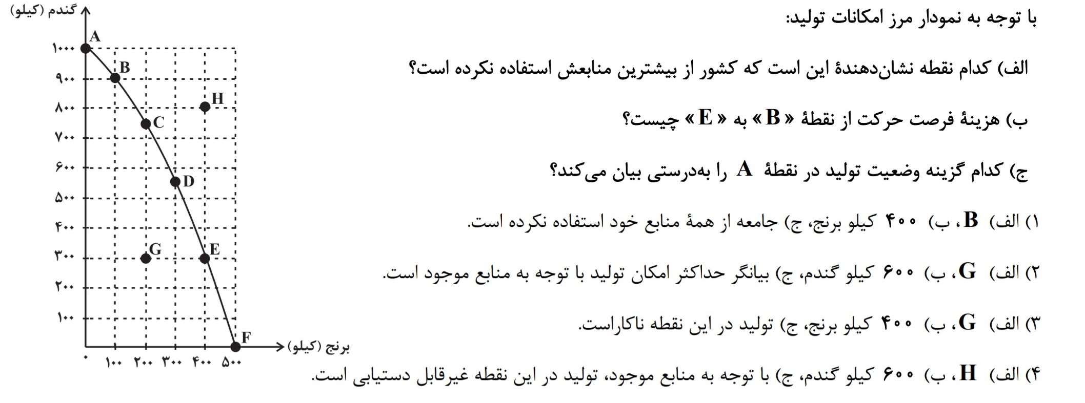3) الف) جا به جا شدن در طول منحنی مرز امکانات تولید ب) جا به جا شدن در طول منحنی مرز امکانات تولید ج) جا به جا شدن در طول منحنی مرز امکانات تولید د) انتقال منحنی مرز امکانات تولید