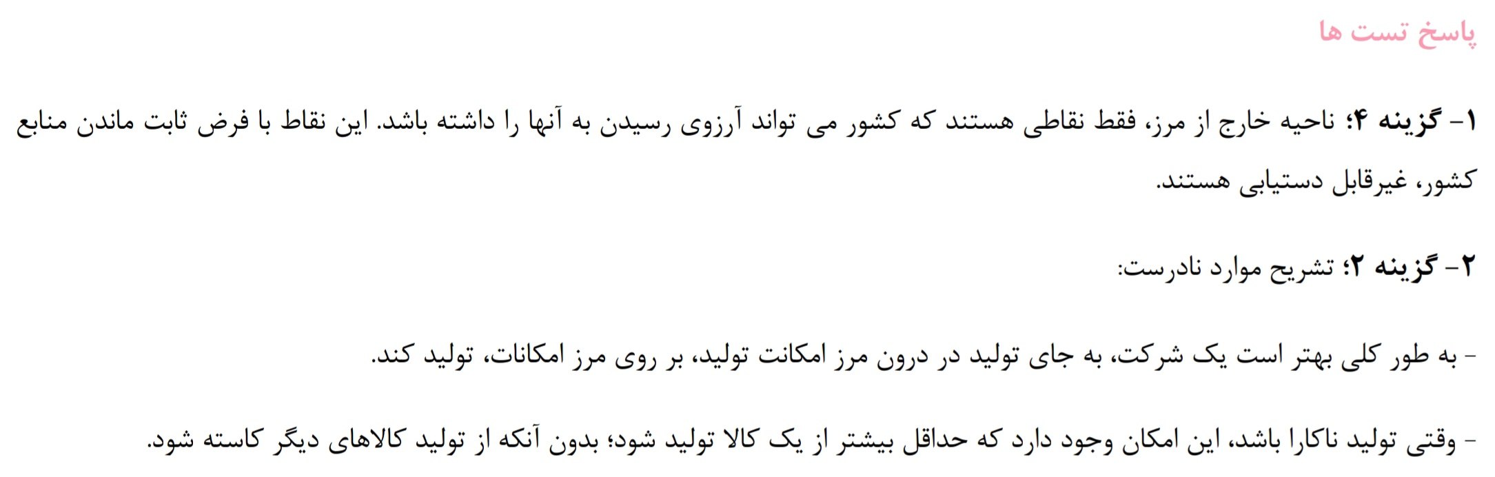 1- ناحیه ... امکانات تولید، فقط نقاطی هستند که کشور می تواند آرزوی رسیدن به آنها را داشته باشد. این نقاط با فرض ثابت ماندن منابع کشور، ... هستند. (متوسط – آزمون کانون، 29 مرداد 1400)