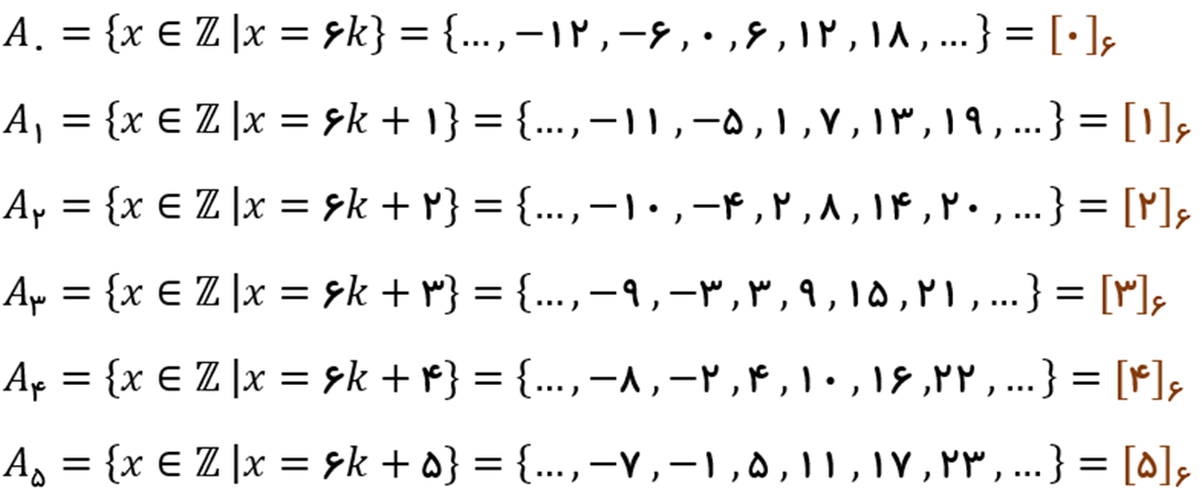 ![]() بالاخره وارد بخش بسیار جذاب و اصلی این فصل شدیم... اصولاً این مبحث در مهندسی کامپیوتر و خیلی از فناوریهای امنیتی از اجزای اساسی حساب میشه... قبلاً یه اشاره خیلی مختصر به همنهشتی کرده بودیم. بیاید یه بار دیگه افراز مجموعه اعداد صحیح با قضیه تقسیم رو ببینیم. مثلاً برای عدد 6 ، به صورت زیر افراز میکنیم:
