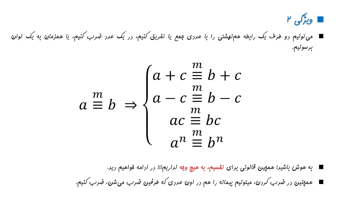 یه جمله معروفی هست که میگه « همنهشتیه و استفاده از ویژگیهاش! » همنهشتی بدون ویژگیهاش کاربردی نداره که! بیاید خاصیتها و ویژگیهای همنهشتی را یاد بگیریم. خاطرتون هست برای جبر مجموعهها یک سری قوانین و ویژگی داشتیم؟ اینا هم از نظر کارکرد همون جوری هستن.
