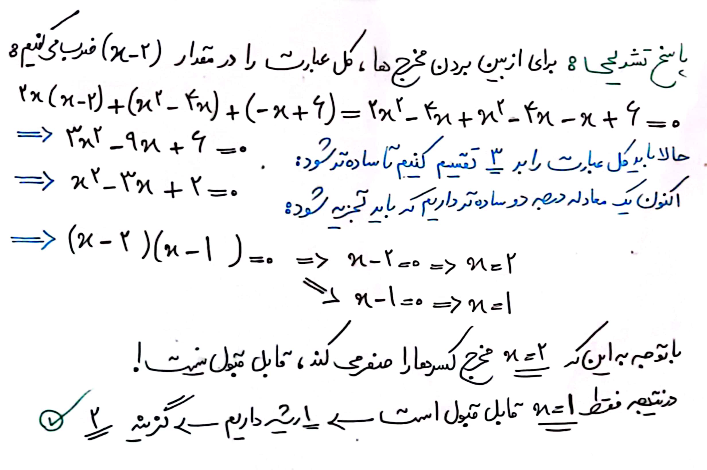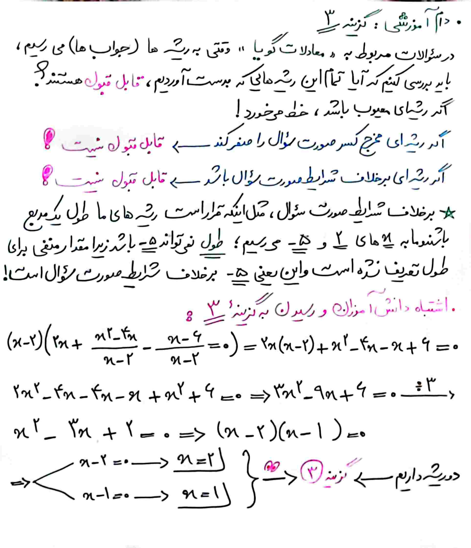 برای حل معادلات گویا ، کسرها را تجزیه و ساده میکنیم و با از بین بردن مخرج ها ، به یک معادله ساده تر میرسیم و ریشه ها را بدست می آوریم .
