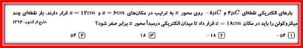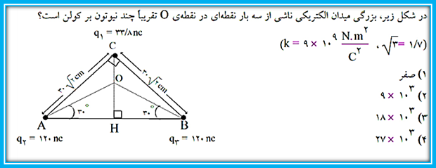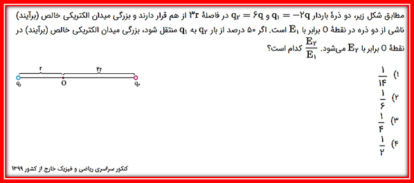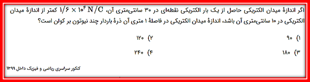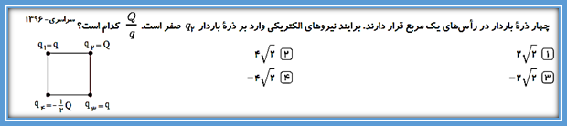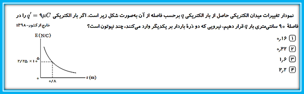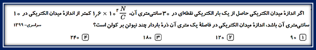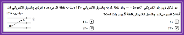 | چند تا از موارد زیر جزو ویژگی های خطوط میدان الکتریکی است؟ الف)تراکم خطوط میدان الکتریکی معرف بزرگی میدان است. ب)خطوط میدان الکتریکی از بار مثبت خارج و به بار منفی وارد می شود. ج)خطوط میدان الکتریکی یک دیگر را قطع می کنند. د)بردار میدان الکتریکی در هر نقطه عمود بر خط میدانی است که از آن نقطه عبور می کند. 1)صفر 2)یک 3)دو 4 )سه |