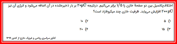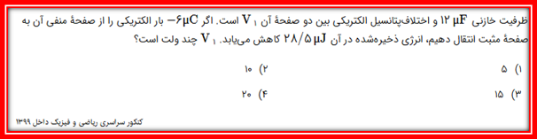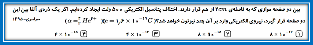پاسخ تشریحی: گزینه صحیح:4 گزینه دام:3 بررسی تست: به این الکترون دو نیرو وارد می شود:1-نیروی وزن رو به پایین 2-نیروی میدان الکتریکی رو به بالا بناباین نمی توان گفت جهت شتاب به کدام سمت است ولی مقدارش ثابت است. بررسی دام: دانش آموز اگر دقت نکند و کلمه الکترون را درست مشاهده نکند دچار اشتباه شده و در دام تست قرار میگیرد(با عنوان پروتون جلو می رود) و دچار اشتباه میشود. |