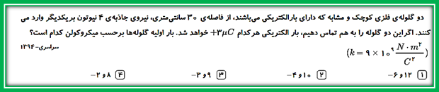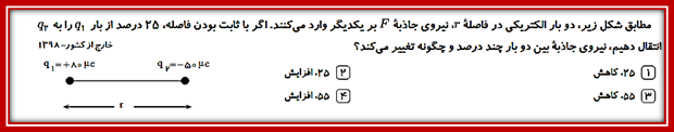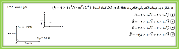 | الکترونی را به صورت افقی به درون ناحیه ای که میدان الکتریکی یکنواخت قائم و روبه پایینی است می اندازیم، کدام گزینه جهت و اندازه بردار شتاب الکترون را درست می گوید؟ 1)روبه پایین-متغییر 2)روبه بالا-متغییر 3)رو به پایین-ثابت 4 )نمیتوان گفت-ثابت |