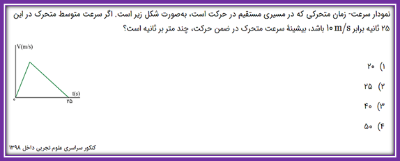 پاسخ تشریحی: گزینه صحیح:2 گزینه دام:1 بررسی تست: به ترتیب شیب نمودار های مکان-زمان و سطح زیر نمودار سرعت-زمان،سرعت و تغییرات جابه جایی را نشان می دهند. بررسی دام: دانش آموز اگر دقت نکند در بخش دوم به کلمه سطح زیر نمودار می تواند اشتباه کند و شیب نمودار سرعت-زمان را مد نظر بگیرد که اون وقت گزینه 1جواب است که دام تست محسوب می شود. |
