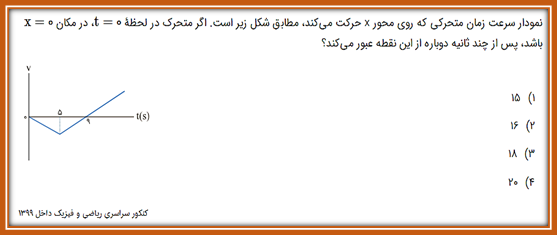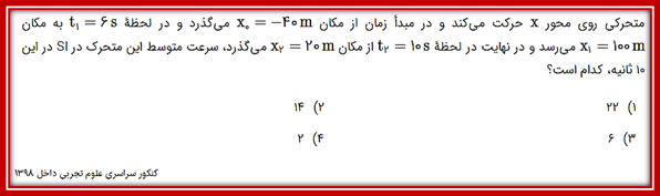 | چند تا از موارد ذکر شده نادرست نیست؟ الف)برداری که مکان انتهایی را به مکان ابتدایی متحرک وصل می کند، بردار جابه جایی گویند. ب)جابه جایی کمیت اصلی ولی مسافت کمیتی فرعی است. ج)جابه جایی کمیتی برداری ولی مسافت کمیتی اسکالر است. د)در جابه جایی لحظه t=2sیعنی از آغاز ثانیه دوم تا تا پایان ثانیه سوم را در بر می گیرد. 1)صفر 2)یک 3)دو 4)سه |