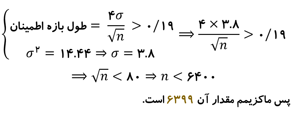 خب ما یک قاعدع کلی برای برآورد بازهای میانگین با اطمینان 95درصد داشتیم: ![]() خب طبق این داستان، بازه ما یک طول خواهد داشت. که برابر اختلاف ابتدا و انتهاشه. که میشه ![]() حالا بریم برای حل : ![]() توضیح دام : دوستای عزیز دقت کنید که با دیدن رادیکال و عدد 80، سریع به سراغ عدد 6400 نرید! دقت کنید که خواسته سؤال با خود عدد 6400 برآورده نمیشه! پس بزرگترین عدد صحیح کوچکتر از 6400 جواب خواهد بود. یعنی 6399. اگر در محاسبات و ساده کردنها دقت لازم رو نداشته باشیم، ممکنه به جای 80 به 8 برسیم. و در این صورت مسیر مشابهه. به اشتباه 64 انتخاب نشه! و اگه دقت هم کرده باشیم 63 رو انتخاب نکنیم!! |
