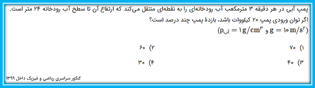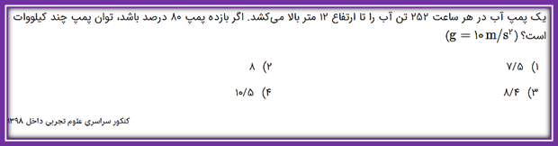 پاسخ تشریحی: گزینه صحیح:2 گزینه دام:3 بررسی تست: مورد ج کاملاً درست است. مورد الف) غلط است.یکای توان در SI ،وات است. مورد ب) غلط است.هر اسب بخار 746 وات است. بررسی دام: دانش آموز اگر خوب دقت نکند و کلمه SI را نبیند می تواند در دام مورد الف افتاده و در نهایت به گزینه 3 برسد که اشتباه است. |