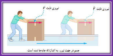 زمانی که جسم در جهت نیرو جابجا می شود: اگر به جسمی نیرو(F) وارد کنیم و جسم در همان جهتی که نیرو وارد کرده ایم جابجا (d)شود ، کار از رابطه زیر بدست می آید: