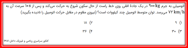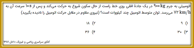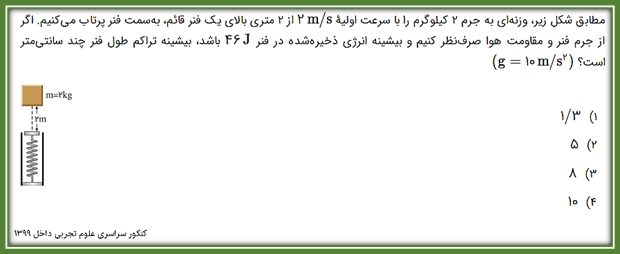 به ترتیب کار نیروی الکتریکی،نیروی کشسانی و نیروی وزن به مسیر حرکت بستگی.......،........ و.......... 1)دارد-ندارد-ندارد 2)ندارد-ندارد-ندارد 3)ندارد-ندارد-دارد 4)دارد-دارد-دارد |