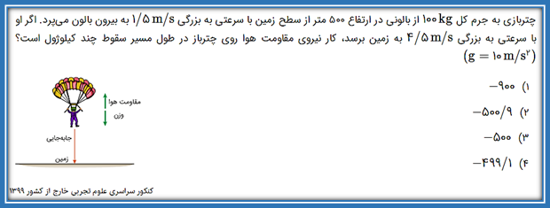 پاسخ تشریحی: گزینه صحیح:2 گزینه دام:3 بررسی تست: طبق عکس و گفته کتاب درسی: به ترتیب کار نیروی الکتریکی،نیروی کشسانی و نیروی وزن به مسیر حرکت بستگی ندارند. بررسی دام: دانش آموز اگر خوب دقت نکند و به عکس های کتاب توجه کافی نداشته باشد در بخش آخر(نیروی وزن) دچار اشتباه شده و در دام تست قرار می گیرد. |