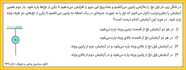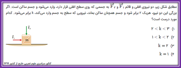 پاسخ تشریحی: گزینه صحیح:1 گزینه دام:2 بررسی تست: جرم یک جسم در همه جا ثابت بوده و وزن آن در همه جا متغییر است. بررسی دام: دانش آموز اگر به ترتیب درست ابتدا جرم بعدا وزن دقت نکند می تواند گزینه 2 را انتخاب کند که دام تست است. |