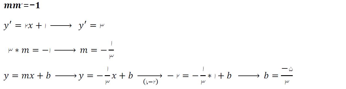 ابتدا باید شیب خط مورد نظر را بدست اوریم. می دانیم خط بر سهمی در نقطه ای که طولش یک است،عمود است.( عرض این نقطه منفی دو است.چرا؟)