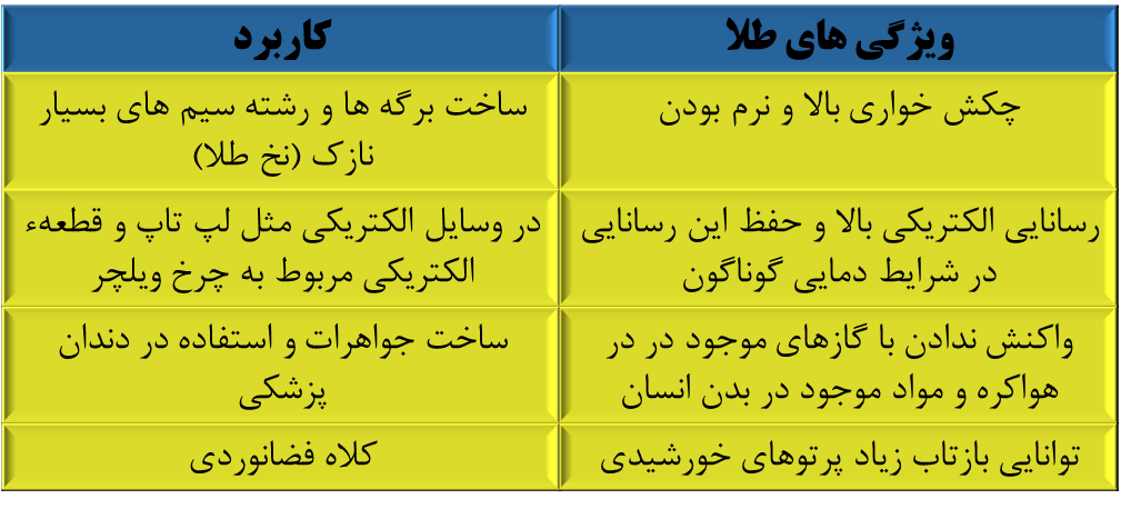 طلا 79Au فلزی ارزشمند و گران از دسته ی d جدول دوره ای است که علاوه بر علاوه بر ویژگی های مشترک فلزها، ویژگی های منحصر به فردی دارد.