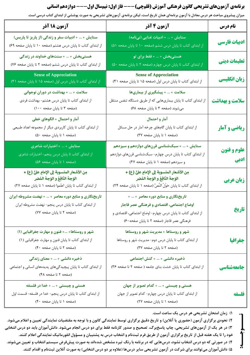 و برنامه اين آزمون در هردو آزمون مطابق برنامه آزمون تستي كانون ، منتها از اول كتاب درسي تا صفحه مشخص شده در برنامه مي باشد