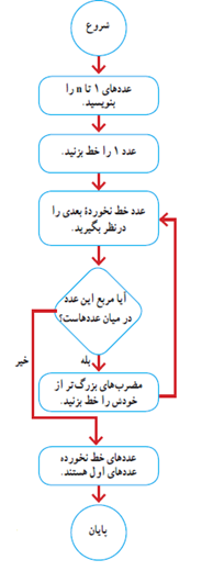نکته : برای تعیین عددهای اول، عدد یک و مضرب های مرکب اعداد اول را خط میزنیم وخط زدن را تا عدد اولی ادامه می دهیم که مربع آن، بین عددهای نوشته شده نباشد.
