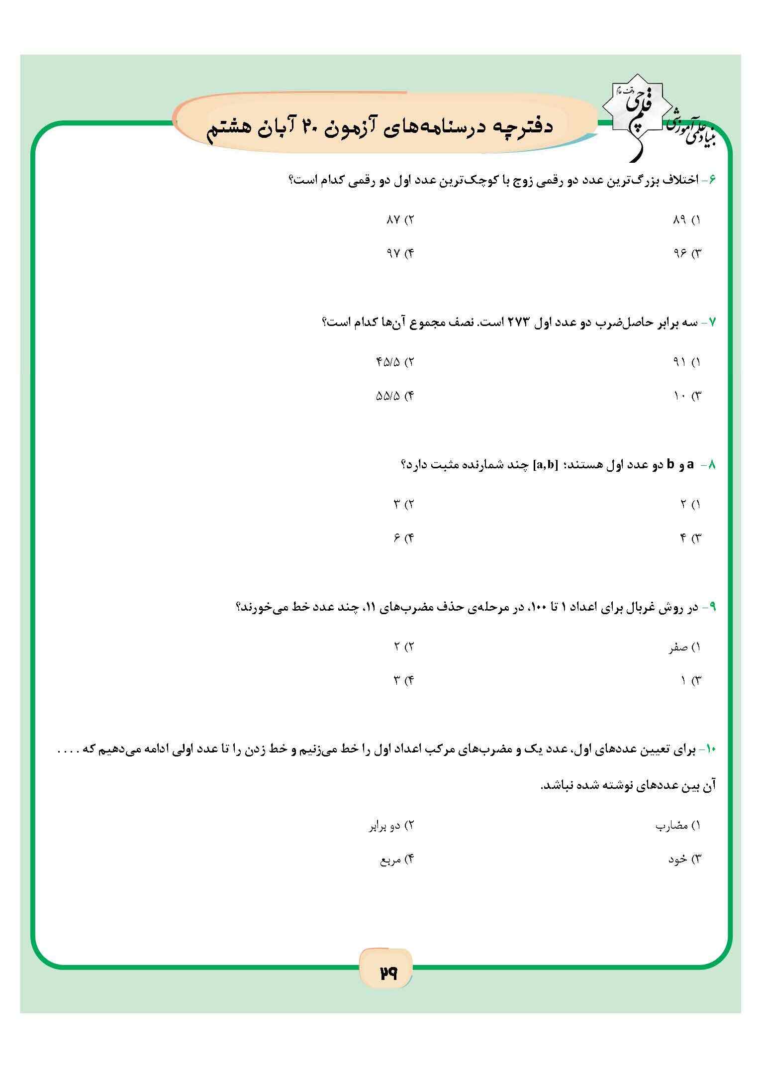 هشتمی ها، سلام!از شروع این هفته آزمونک های 10سئوالی برای تمرین و تکرار مطالب ، متناسب با بودجه بندی آزمون 20آبان را خواهیم داشت.با آزمونک ریاضی شروع میکنیم. آماده اید؟