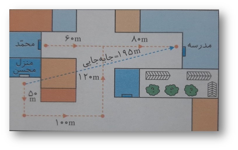 خط چین آبی نشان دهنده جابجایی و خط چین نارنجی نشان دهنده مسافت طی شده از منزل محسن به مدرسه است.