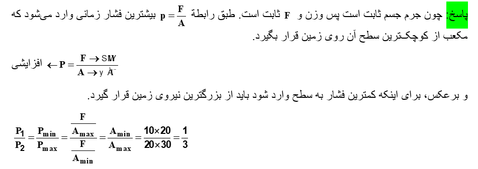 مثال: مکعب مستطیلی به جرم 10Kg و ابعاد 10، 20 و 30 سانتیمتر و اینبار به گونهای روی سطح افقی قرار میدهیم که کمترین فشار به آن وارد کند. و بار دیگر به گونهای قرار میدهیم که بیشترین فشار را به سطح وارد کند. نسبت فشار در حالت اول به دوم چقدر است؟