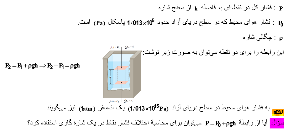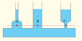همانطور که در علوم سال نهم دیدید، در یک مایع ساکن، نقاط همتراز دارای فشار مساوی هستند برای مثال در شکل زیر فشار نقطههای A و B و C برابر است.