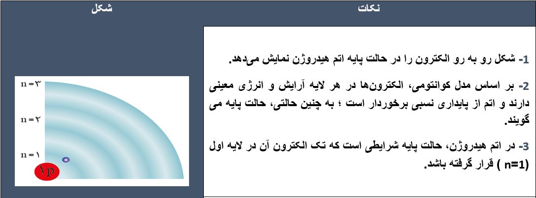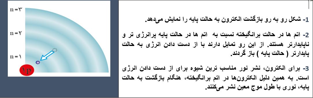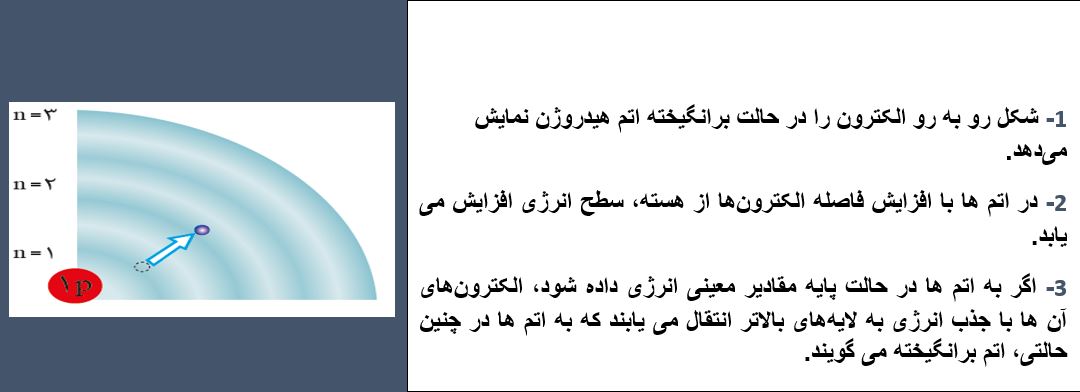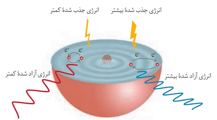 توجه : در یک اتم، هرچه مقدار انرژی جذب شده بیشتر باشد، الکترونها به لایههای بالاتری انتقال می یابند.