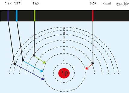 - _ نیلز بور بر این باور بود که با بررسی تعداد و جایگاه نوارهای رنگی در طیف نشری خطی هیدروژن، میتوان اطلاعات ارزشمندی از ساختار اتم هیدروژن بدست آورد.