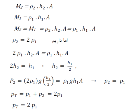 مثال: ظرفی استوانه ای شکل، محتوی مایعی به چگالی ρ و جرم M است. مایع دیگری به چگالی ρ2=2ρ و با جرم M به ظرف میافزاییم. فشار مایع در کف ظرف چند برابر حالت اول خواهد بود؟
