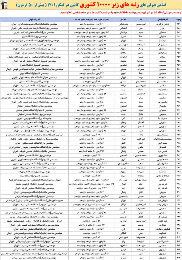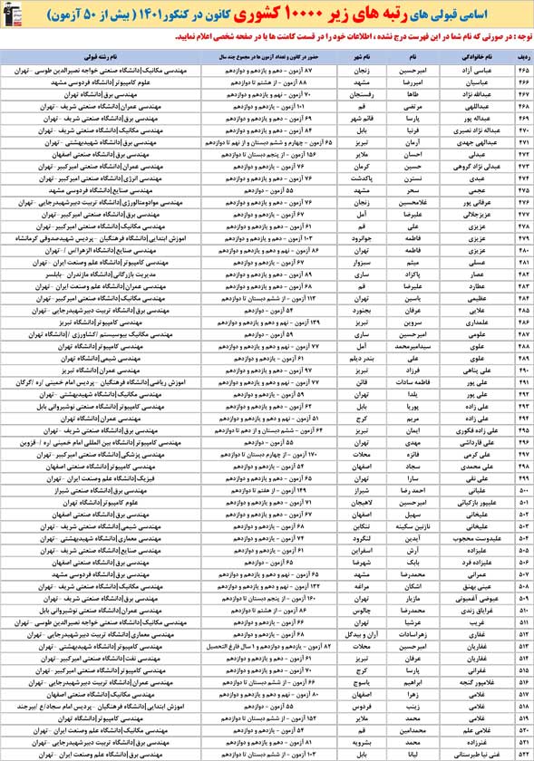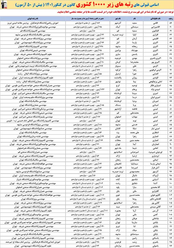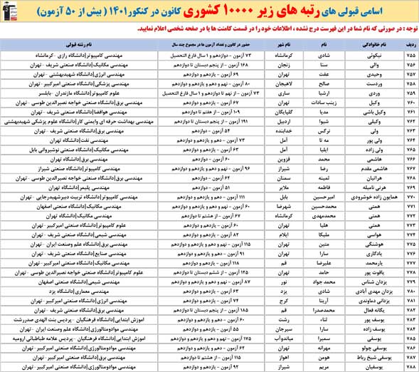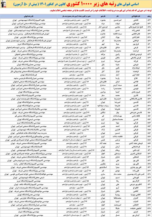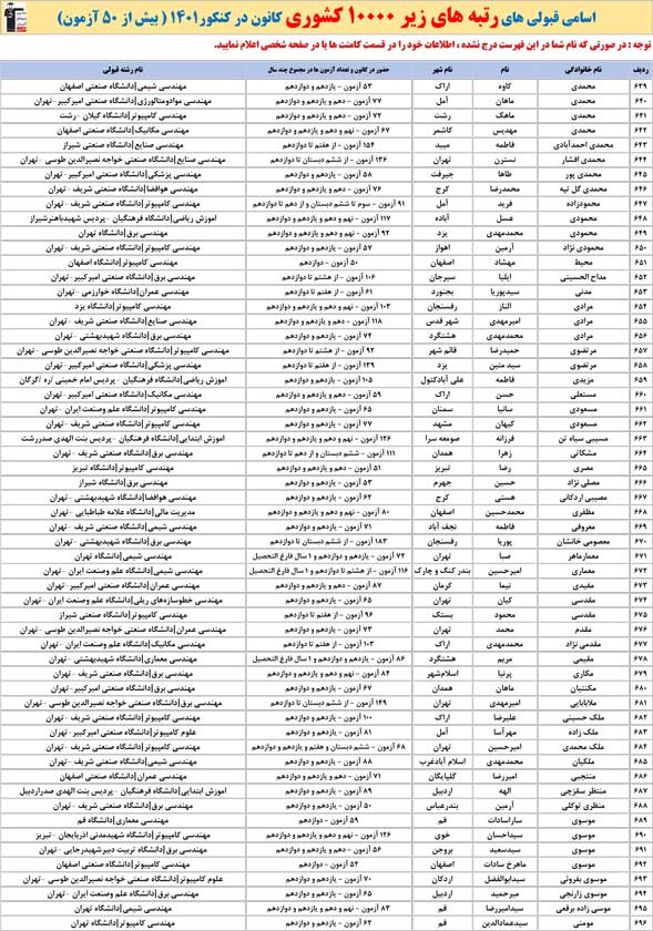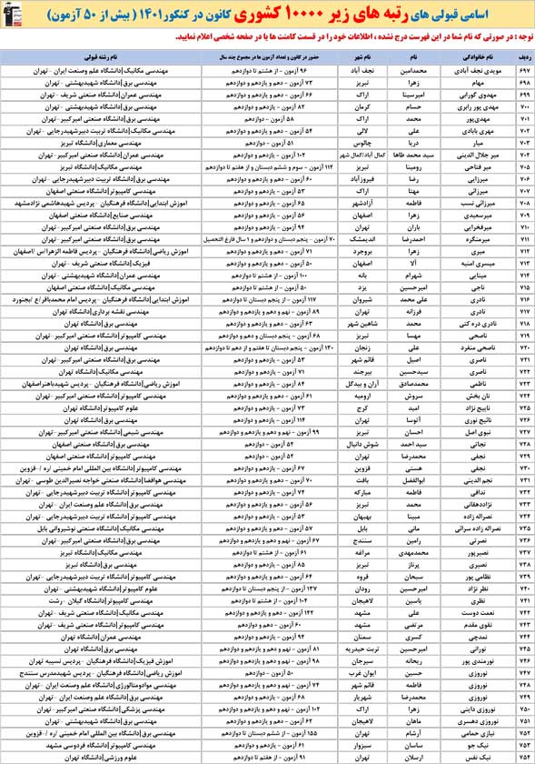 در فهرست زیر که به ترتیب حروف الفبا می باشد ، اسامی قبولی های رشته ریاضی رتبه های زیر 10000 کشوری که در بیش از 50 آزمون شرکت کرده اند درج شده است.
