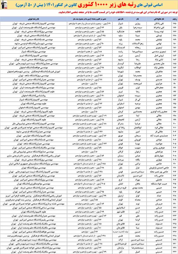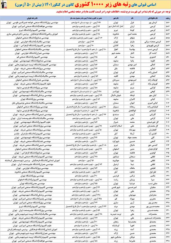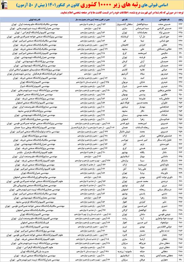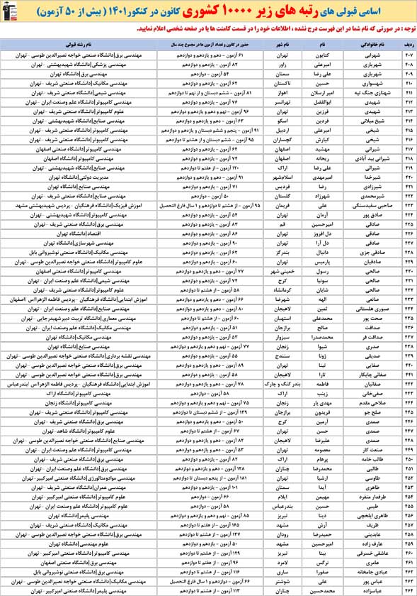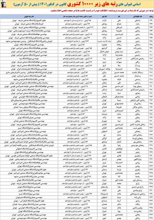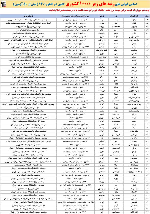 در فهرست زیر که به ترتیب حروف الفبا می باشد ، اسامی قبولی های رشته ریاضی رتبه های زیر 10000 کشوری که در بیش از 50 آزمون شرکت کرده اند درج شده است.