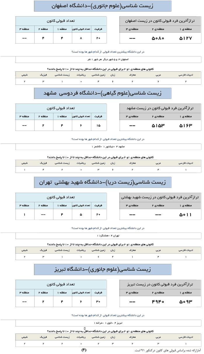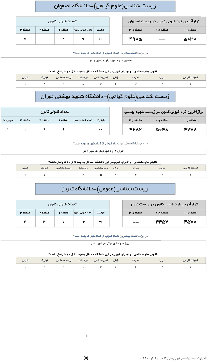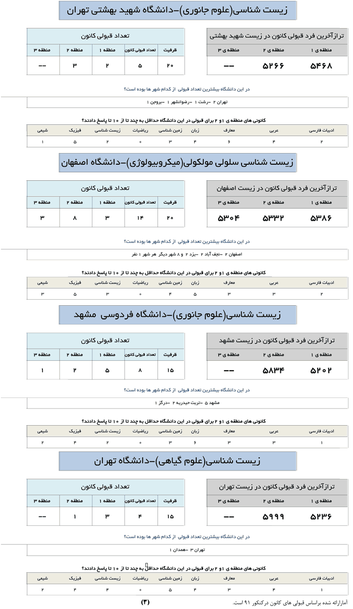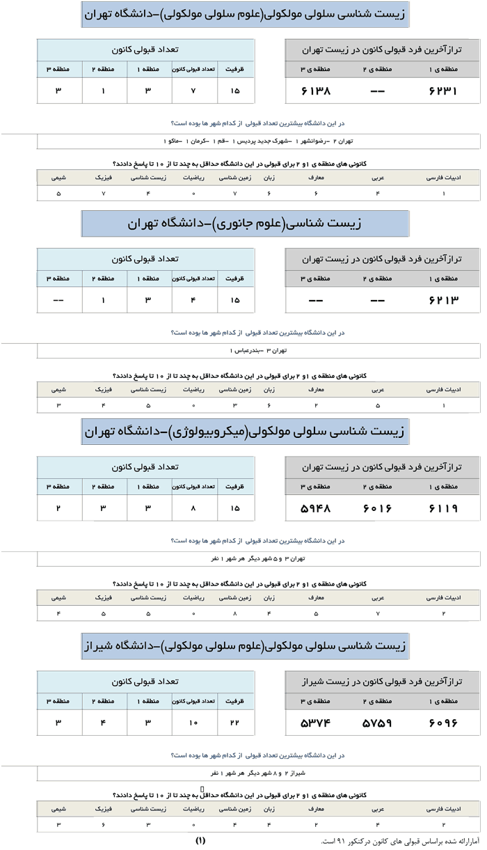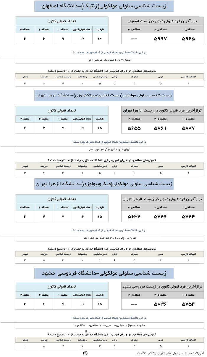 در جدول زیر تراز آخرین فرد قبول شده کانونی در رشته زیست شناسی در دانشگاه های مختلف ارائه شده است.