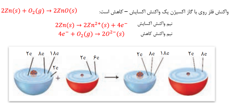 در این واکنش روی الکترون از دست داده و اکسایش یافته در حالی که گاز اکسیژن الکترون گرفته و کاهش یافته است.
