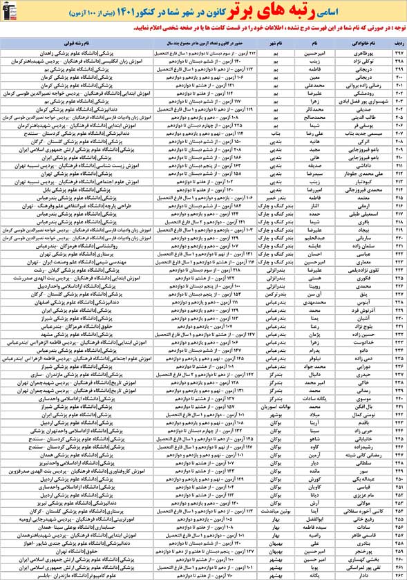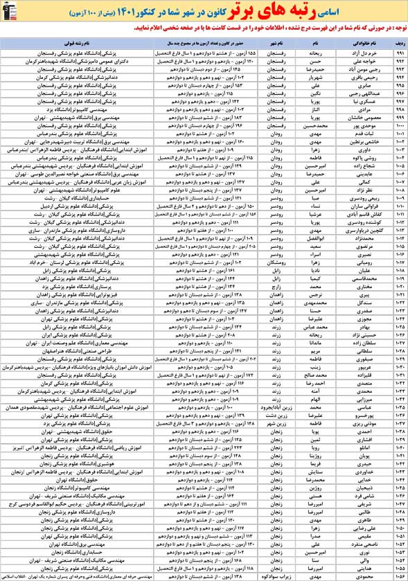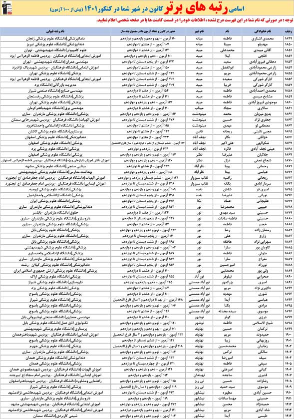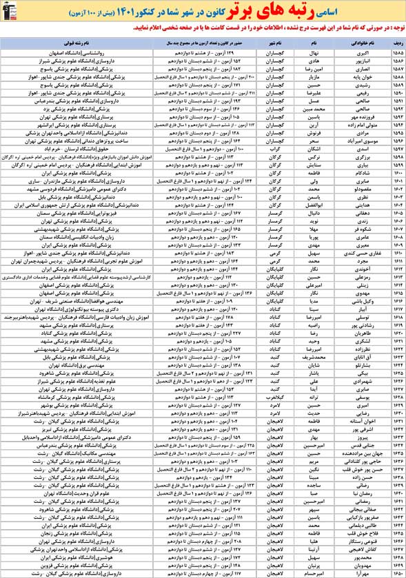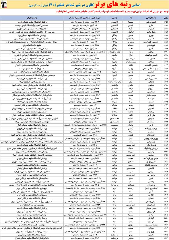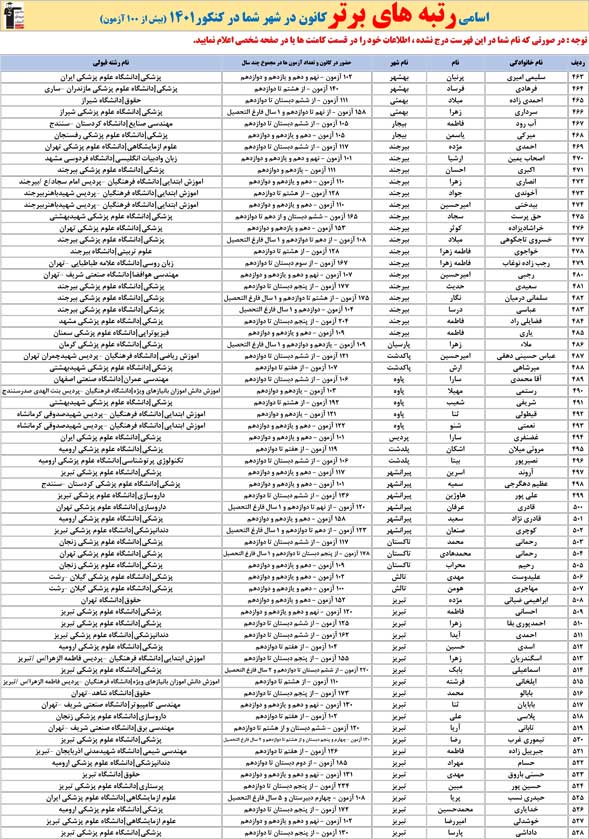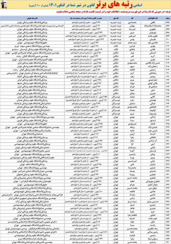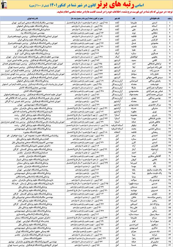 فهرست زیر اسامی قبولی های رشته های ریاضی ، تجربی ، انسانی ، هنر و زبان می باشد که رتبه های زیر 15000 کشوری یا رتبه های زیر 7000 منطقه را کسب کرده اند.