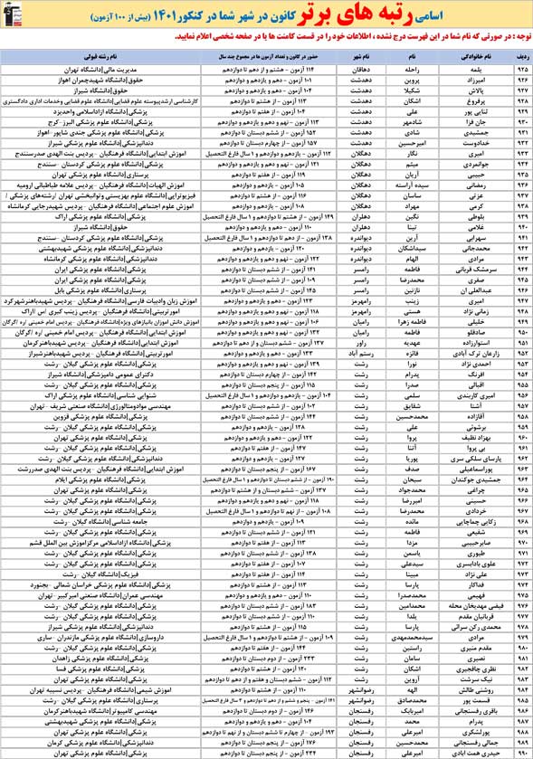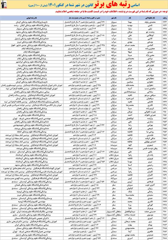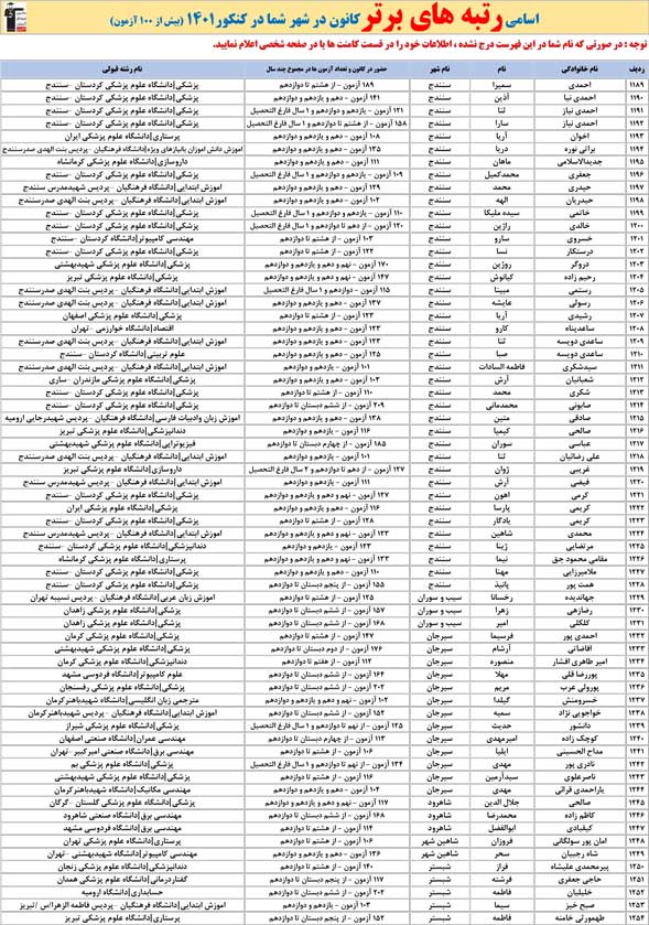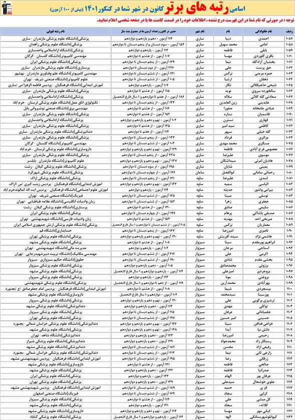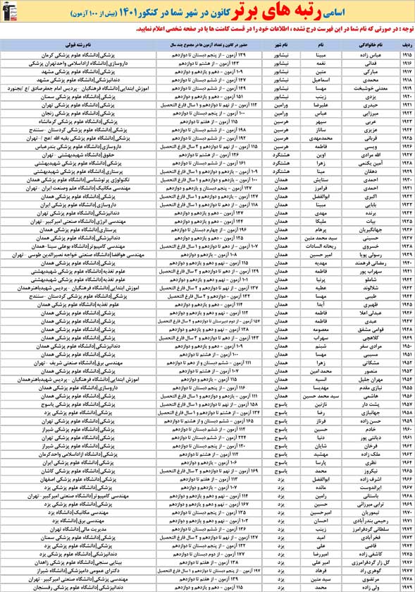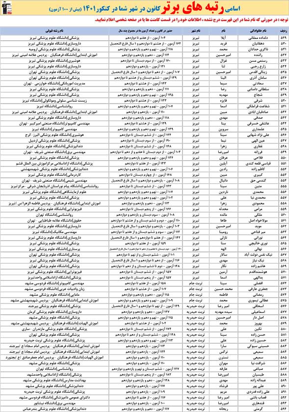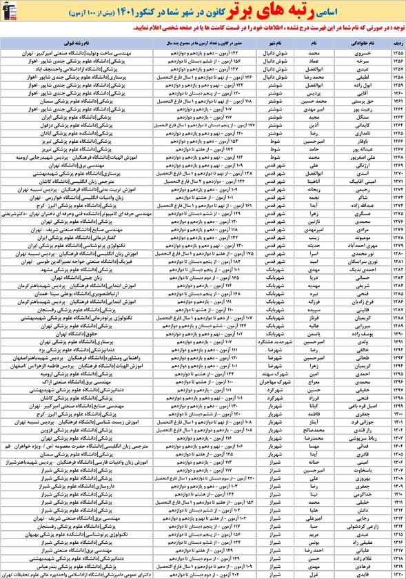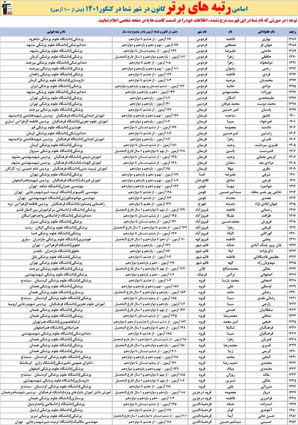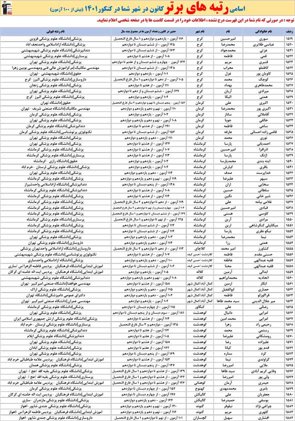 فهرست زیر اسامی قبولی های رشته های ریاضی ، تجربی ، انسانی ، هنر و زبان می باشد که رتبه های زیر 15000 کشوری یا رتبه های زیر 7000 منطقه را کسب کرده اند.