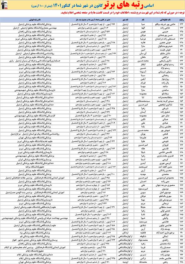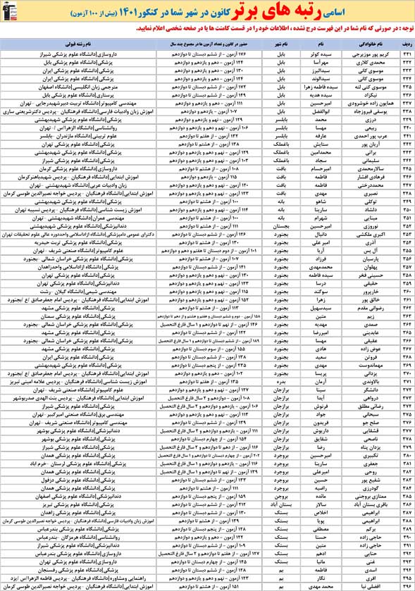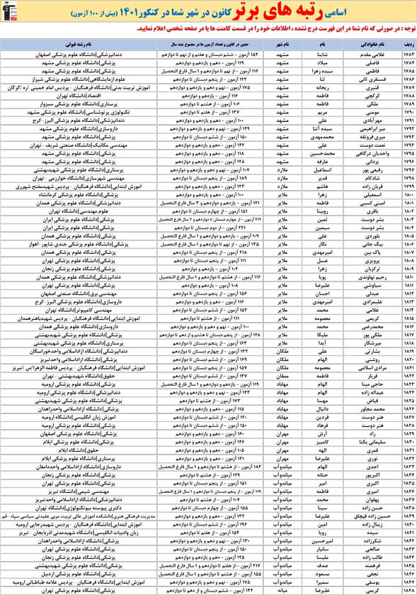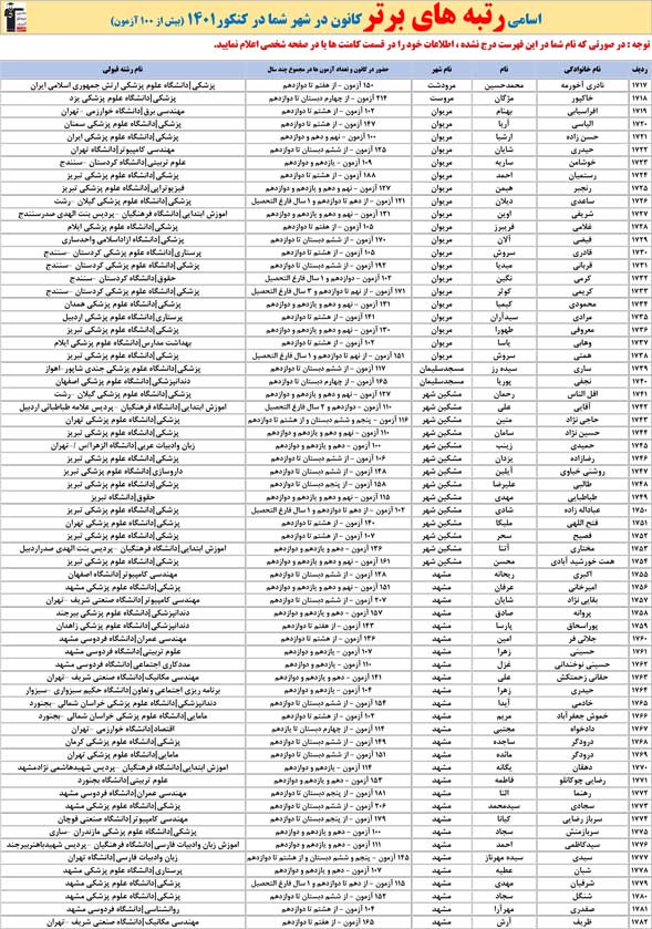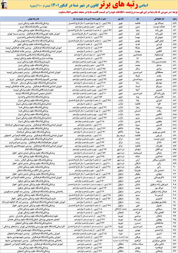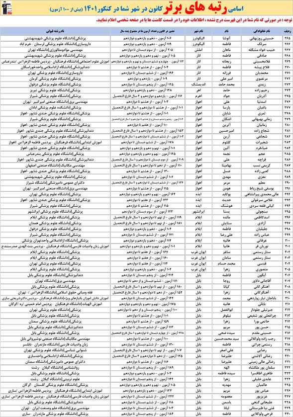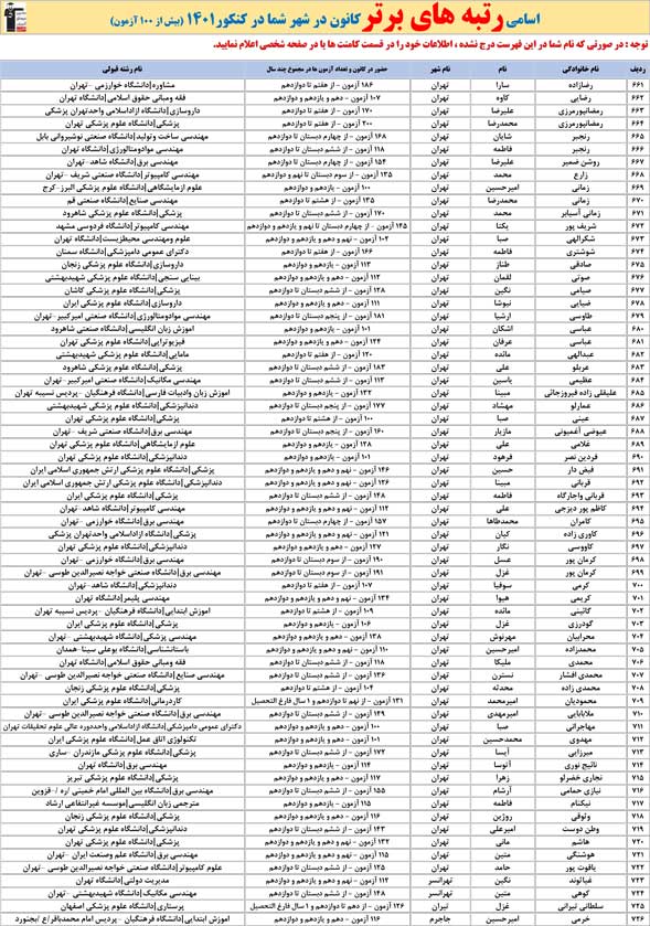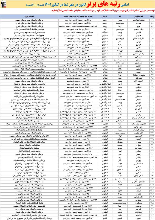 فهرست زیر اسامی قبولی های رشته های ریاضی ، تجربی ، انسانی ، هنر و زبان می باشد که رتبه های زیر 15000 کشوری یا رتبه های زیر 7000 منطقه را کسب کرده اند.