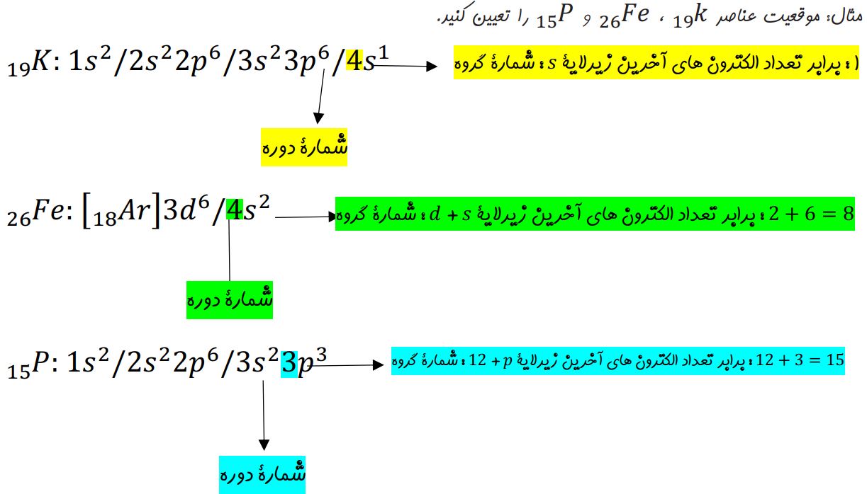 1) تعيين دوره (تناوب): شماره بيرونی ترين لايه در آرايش الكترونی يك عنصـر نشـان دهنـده شـماره دوره آن است.