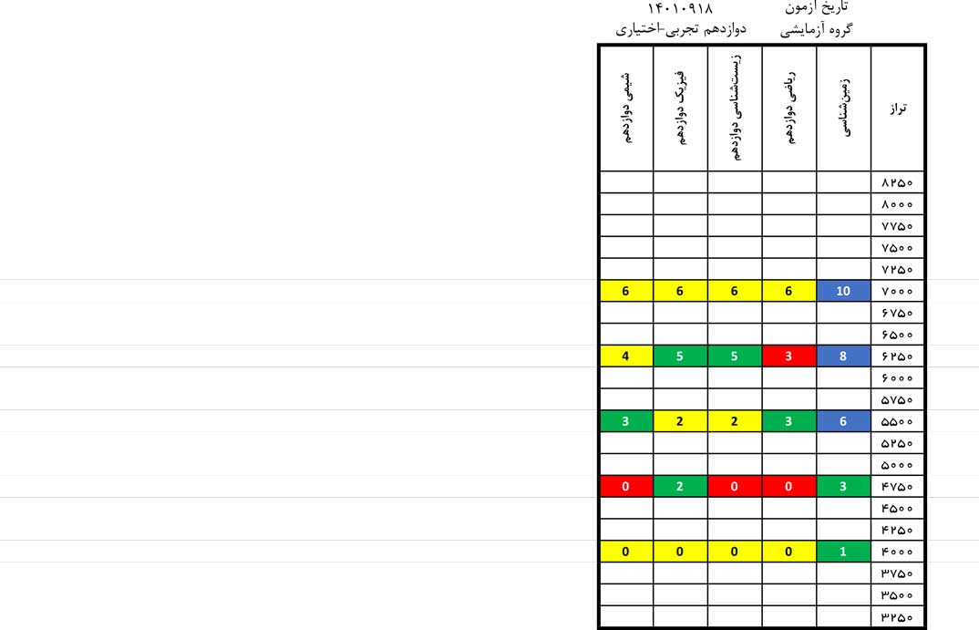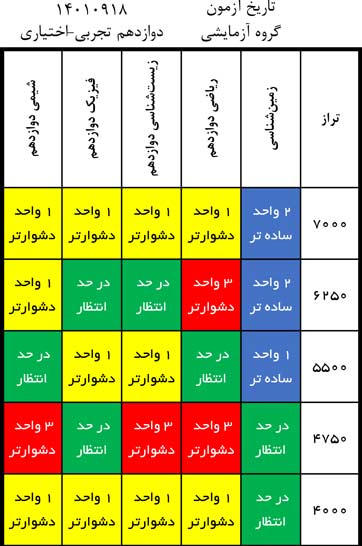 در این جدول برای هر درس رنگ های متفاوتی را می بینید .ممکن است یک درس برای یک بازه ی تراز دشوار و برای بازه ی تراز دیگر متعادل یا ساده باشد . ابتدا نمره ی تراز خود را در نظر بگیرید و سپس رنگ های هر درس را در بازه ی تراز خود ببینید . متوجه می شوید که آیا آن درس برای شما ساده تر از حد انتظار یا دشوارتر بوده یا این که متعادل بوده است .