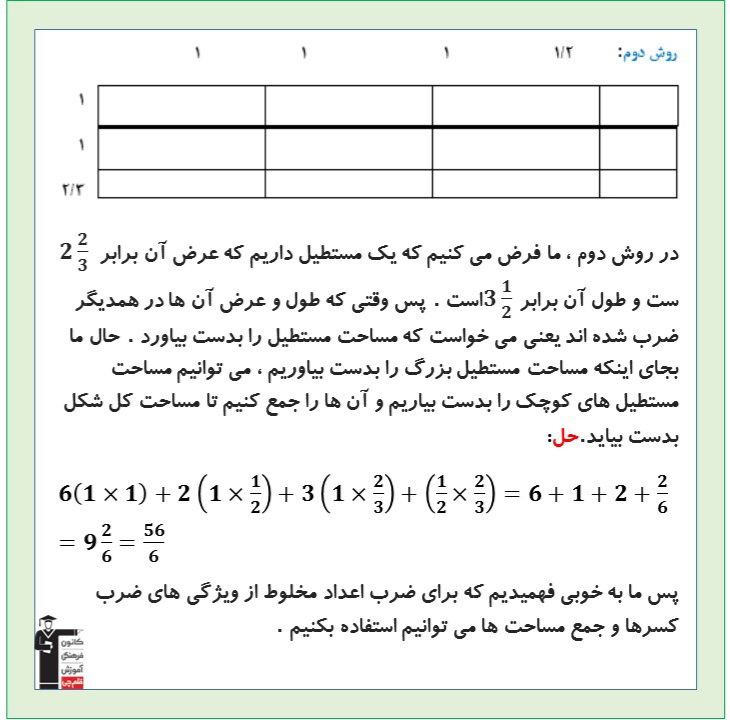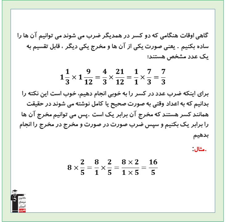 دانش آموزان عزیز سلام در این بخش درسنامه ریاضی پنجم بخش ضرب اعداد مخلوط برای شما بارگزاری شده است. با مطالعه آن ها به مرور و تثبیت مطالب بپردازید. موفق باشید