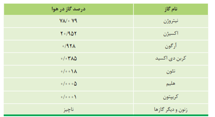 - _ جدول بالا نشان میدهد بخش عمده هواكره را دو گاز نیتروژن و اكسیژن تشكیل میدهد.