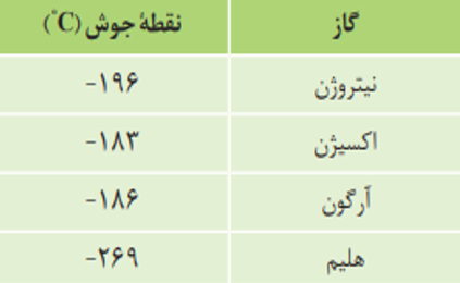 _ با توجه به نقطۀ جوش گازهای تشکیل دهندۀ هوای مایع، با عبور هوای مایع از ستون تقطیر ابتدا گاز نیتروژن، سپس آرگون